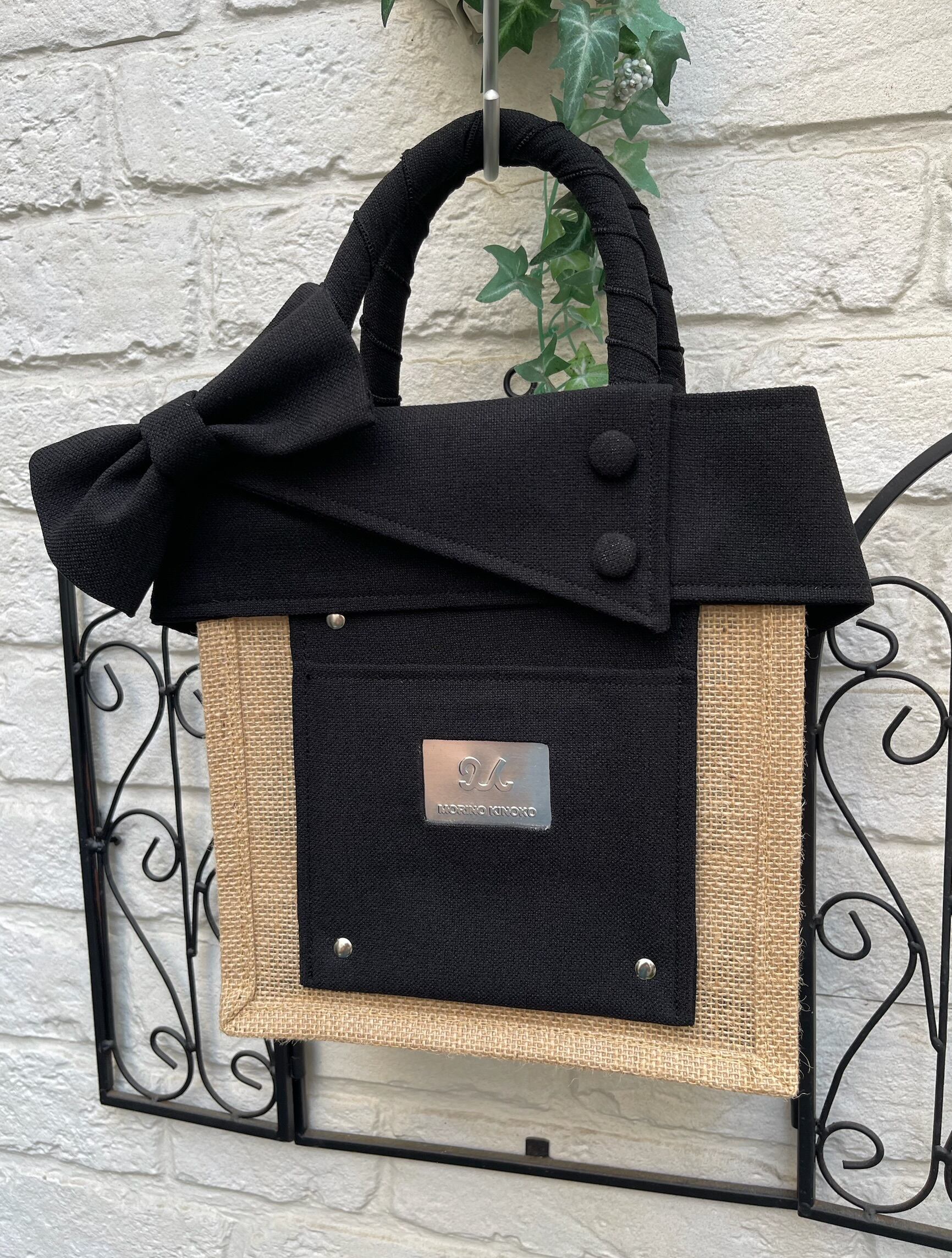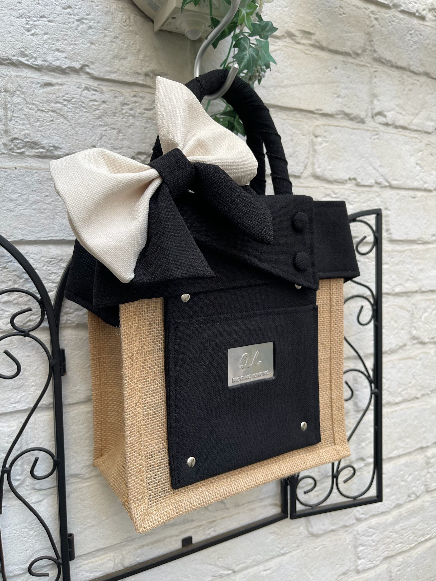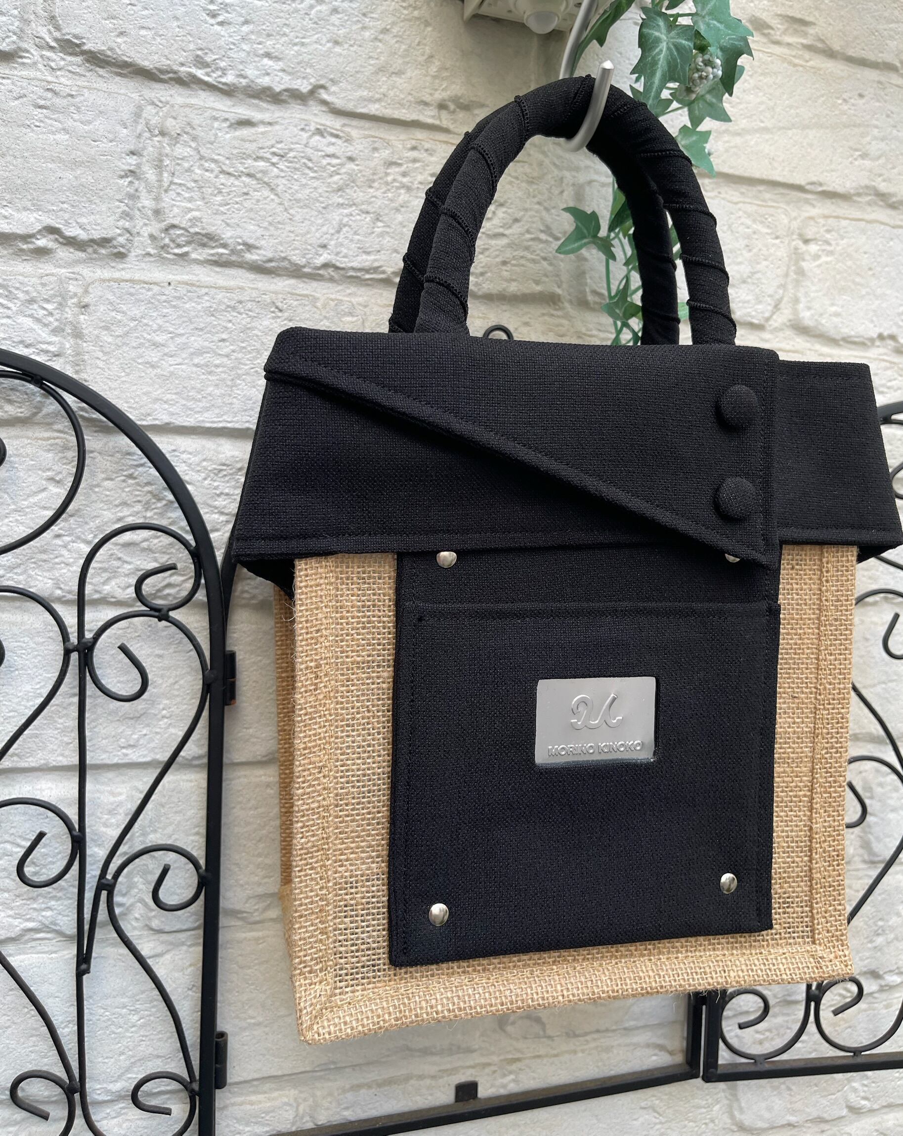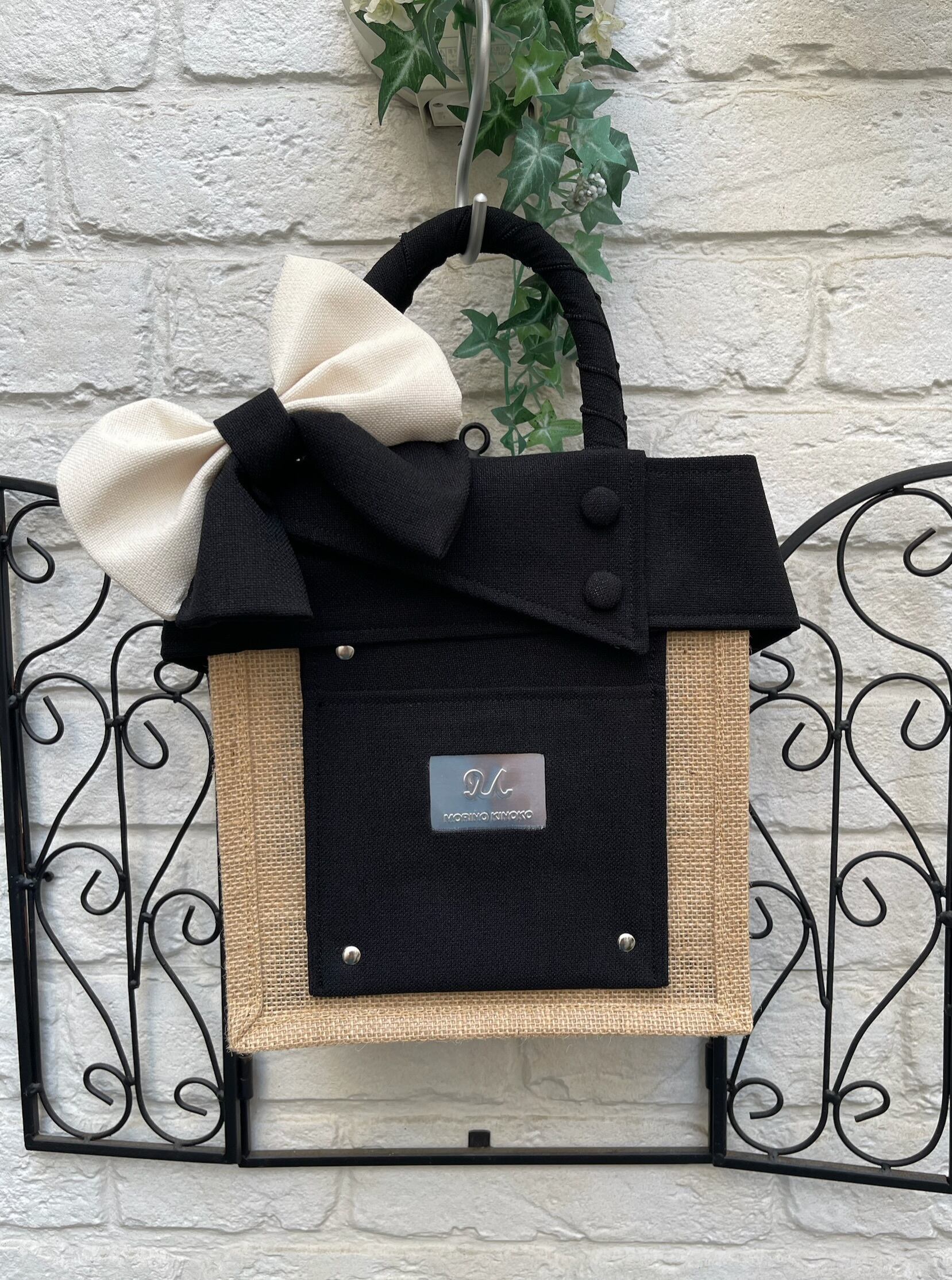 シックなブラックジャケットを纏ったような、クラシカルで個性的なジュートバッグ。