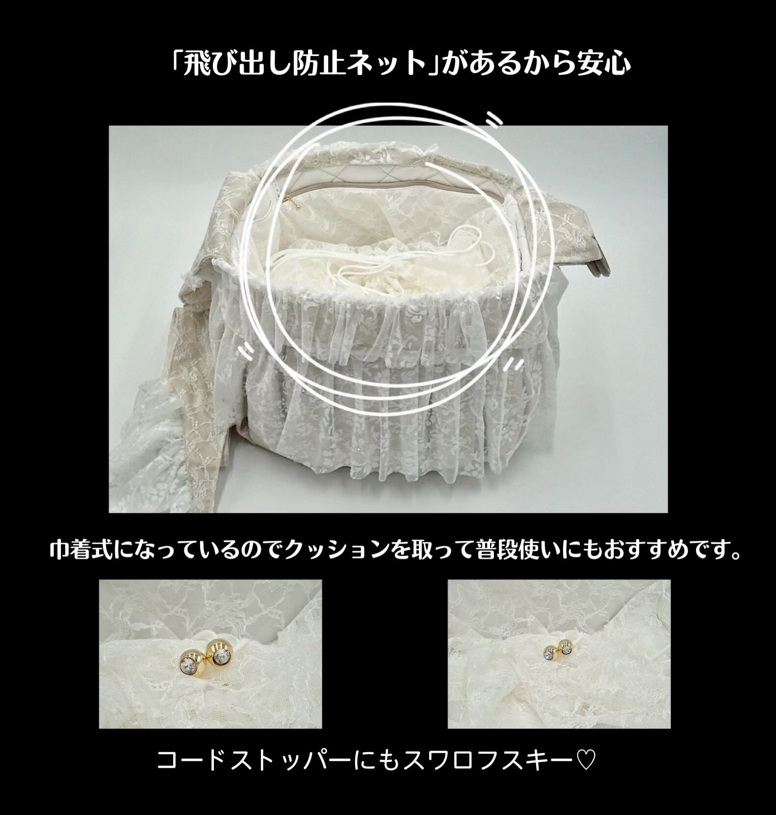 • 飛び出し防止ネット(巾着式)で安心